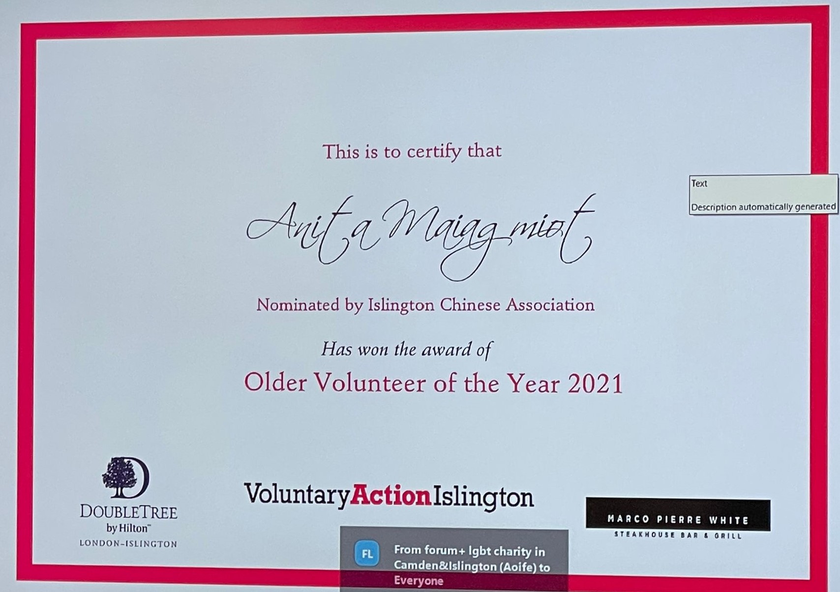 We are delighted to announce that Ms. Anita Maraguinot, the volunteer nominated by Islington Chinese Association (ICA), has won the award of Older Volunteer of the Year 2021. This award was presented by Voluntary Action Islington to celebrate the achievements of people volunteering in Islington.