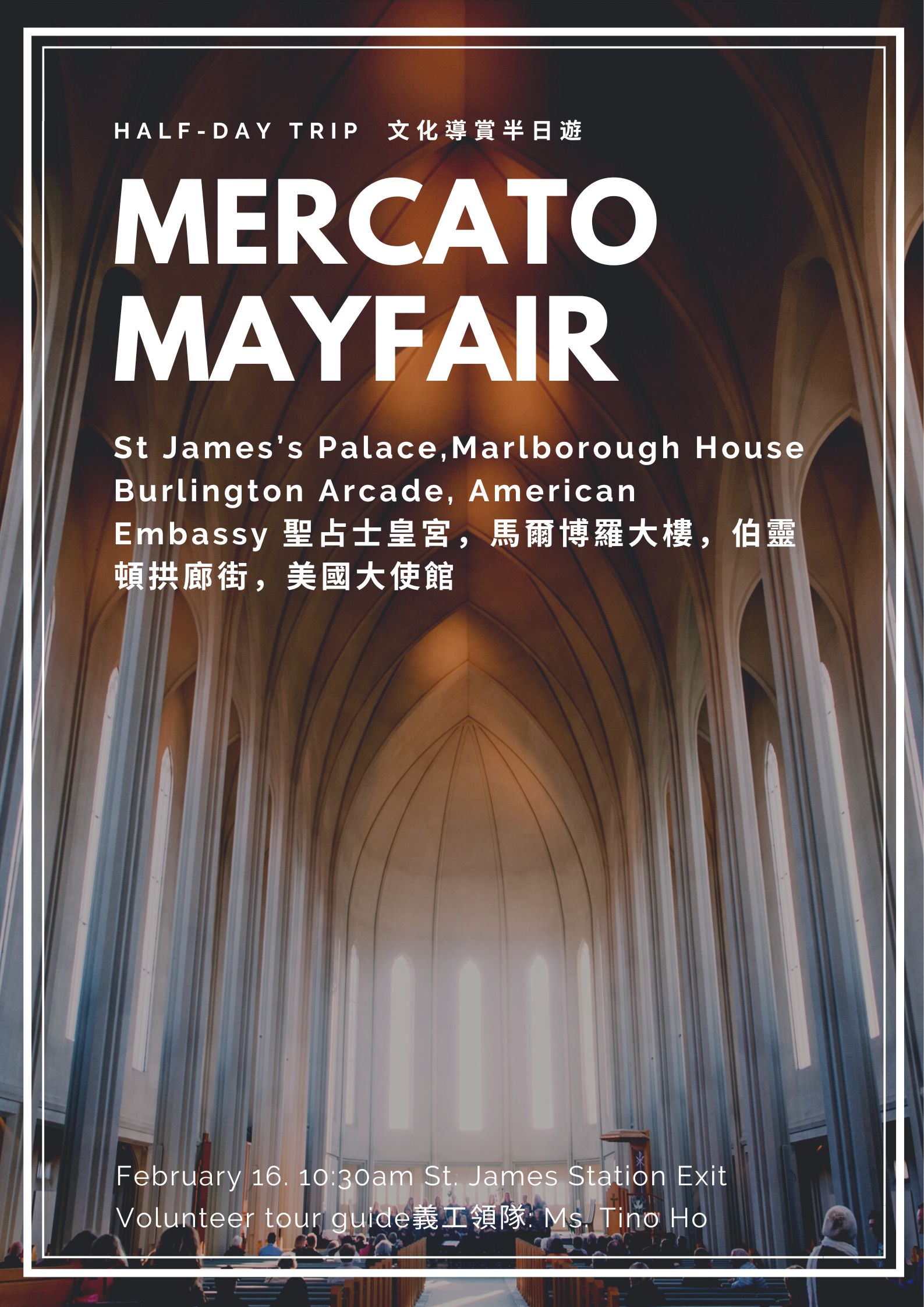 Mercato Mayfair是一文化及可持续市场的完美结合,座落于Mayfair地区。 两层高的建筑有各类酒吧食肆,地牢提供地方举办各式活动,供人学习及分享。 为配合Mercato Mayfair使命,食物及配料均尽量采用可持续来源。 导赏团除参观这特色建筑,更会于区内游览各特色景点,由资深义工领队Tina Ho讲解。