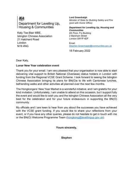 主理BNO簽證新移民融入政策的社區事務國務大臣Lord Greenhalgh親函協會,表達對活動的支持,他表示:「香港人新年巿集這個新意思很不錯,我予以全力支持;祝願你們和依士靈頓華人協會的慶祝活動,以及未來支持BNO簽證新移民的工作萬事如意!」