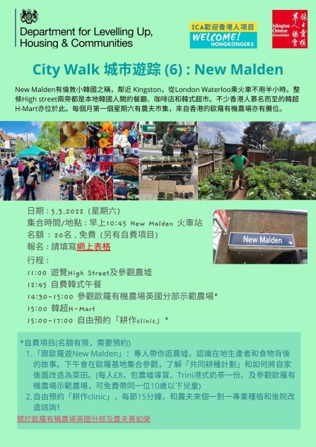 ICA將於3月5日舉辦城巿遊踪,帶大家去有倫敦小韓國之稱的New Malden,遊覽每月一次的星期六農夫巿集,食韓式午餐,去韓超購物;參加者更可自費£8報名參觀歐羅有機示範農場,享受Trini港式奶茶。名額有限,先到先得。