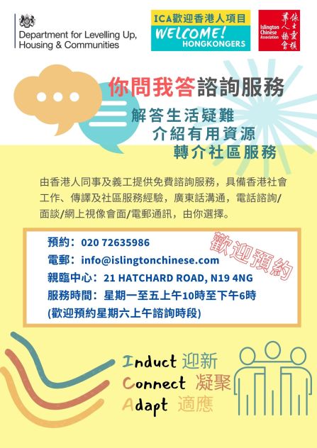 依士靈頓華人協會(ICA)現提供免費諮詢服務,為新抵埗的香港人解答有關生活疑難,包括介紹社區資源、政府公共服務,及轉介至相關政府或地區組織以獲得所需協助。