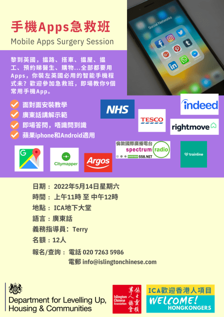 手機Apps急救班 — 黎到英國,揾路、搭車、揾屋、揾工、預約睇醫生、購物…全部都要用Apps,你裝左英國必用的智能手機程式未?歡迎參加急救班,有廣東話義務指導員Terry即場教你9個常用手機App。