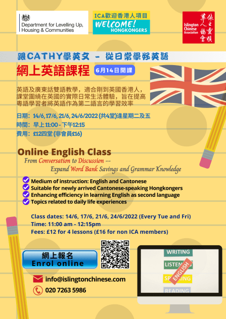 This online English class is organised by Islington Chinese Association as part of its Welcome Hongkongers Programme supported by the Department for Levelling Up, Housing & Communities.