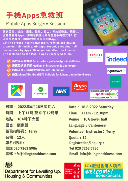手機Apps急救班又黎啦! 5月的急救班反應踴躍,現6月加開一班,義務指導員Terry, 再次即場介紹及安裝英國常用手機Apps. 義工阿TIM 同William亦熱心協助大家裝Apps. 大家黎到英國,揾路、搭車、揾屋、揾工、預約睇醫生、購物…全部都要用Apps,你裝左英國必用的智能手機程式未?