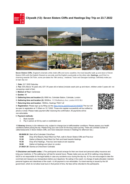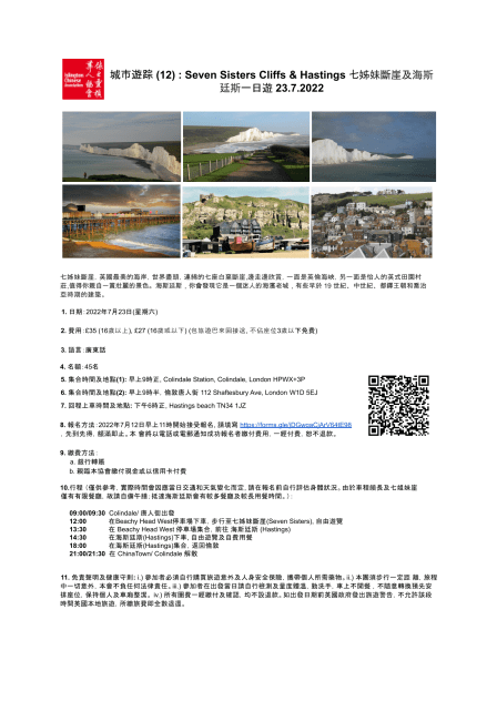 10.行程 (仅供参考,实际时间会因应当日交通和天气变化而定, 请在报名前自行评估身体状况。由于车程颇长及七姐妹崖仅有有限餐厅,故请自备午膳;抵达海斯廷斯会有较多餐厅及较长用餐时间。): 09:00/09:30 Colindale/ 唐人街出发