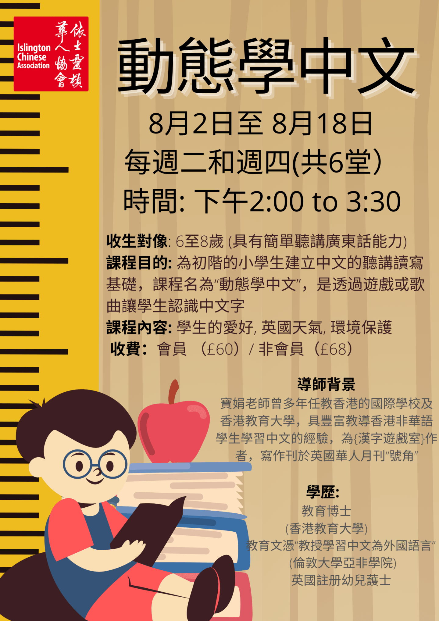 課程目的 : 為初階的小學生建立中文的聽講讀寫基礎,課程名為“動態學中文”,是透過遊戲或歌曲讓學生認識中文字