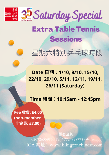 Thank you for your continuous support and our volunteer coaches to support the table tennis on Saturday morning sessions. The schedule of extended Saturday table tennis in October and November is as follows: