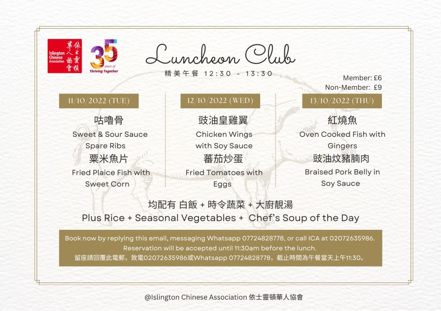 ICA午餐會菜單,歡迎預訂,留座請回覆此電郵,致電02072635986或Whatsapp 07724828778,截止時間為午餐當天上午11:30。