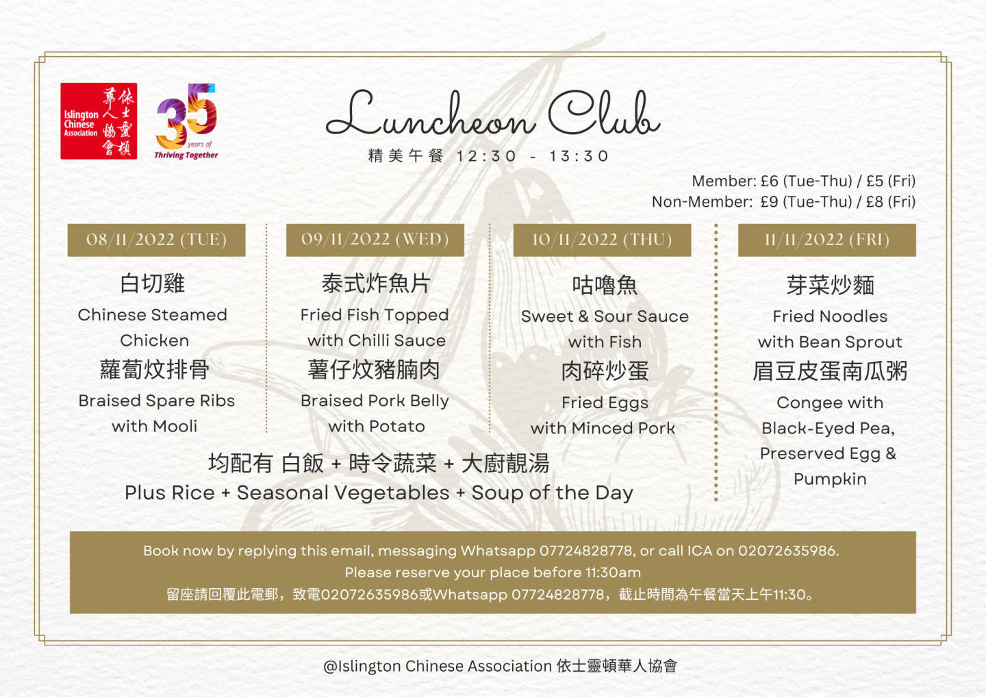 ICA午餐會菜單,歡迎預訂,留座請回覆此電郵,致電02072635986或Whatsapp 07724828778,截止時間為午餐當天上午11:30。