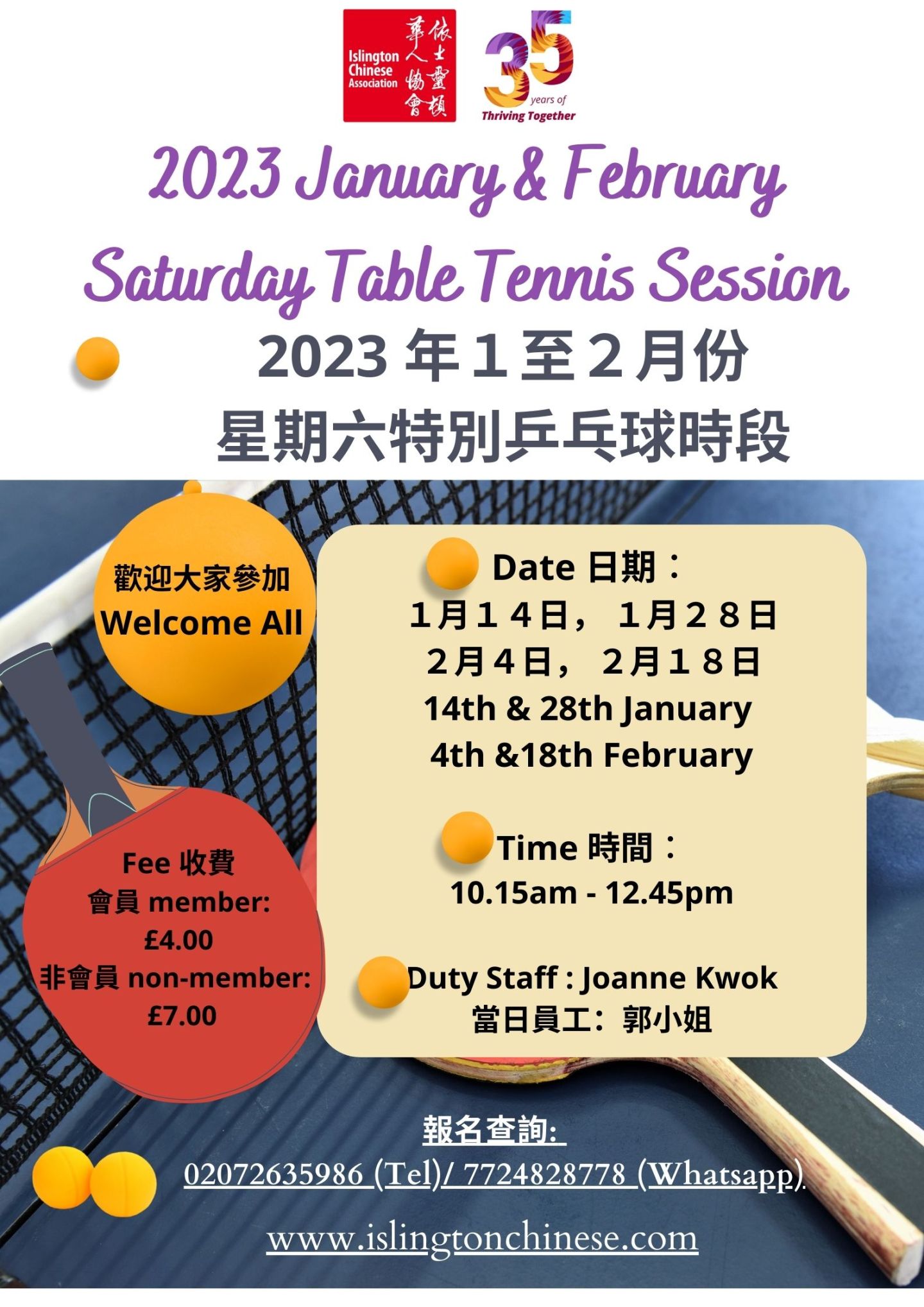 2023 年1至2月份星期六特別乒乓球時段將於以下日子舉行,歡迎大家參加。2023 January & February Saturday Table Tennis Session will be arranged on the following dates. Save the dates and look forward to seeing you!