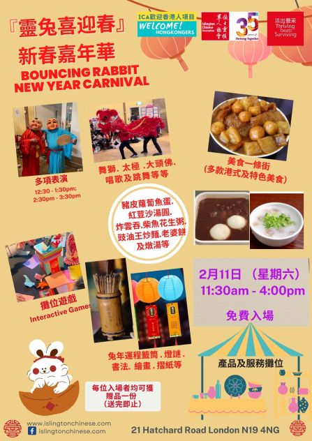 「靈兔喜迎春 」 新春嘉年華 將於2 月11日(11:30am – 4:00pm) 在依士靈頓華人協會舉行。節目如下,並會陸續增加內容,請密切注意我們的更新。