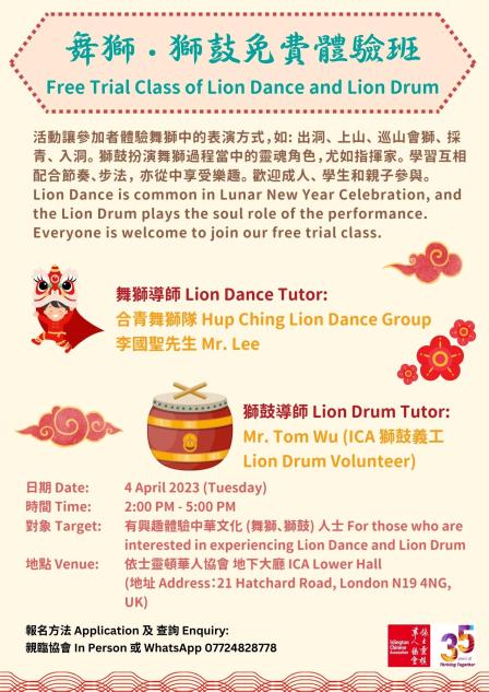 Lion Dance is common in Lunar New Year Celebration, and the Lion Drum plays the soul role of the performance. Everyone is welcome to join our free trial class. Enquiry: WhatsApp 07724828778