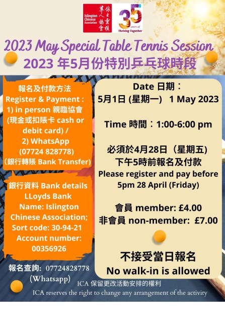 5月1日Bank Holidays 將會安排特別乒乓球時段 (下午1時至6時),請於4月28日前報名及付款. 不接受當日報名。報名及付款詳情請參閱海報. Special Table Tennis session will be arranged on Bank Holidays, 1 May from 1pm-6pm. Please register and pay before 5pm 28 April. No walk-in will be allowed on 1 May. Details of registration and payment, please refer to the poster.