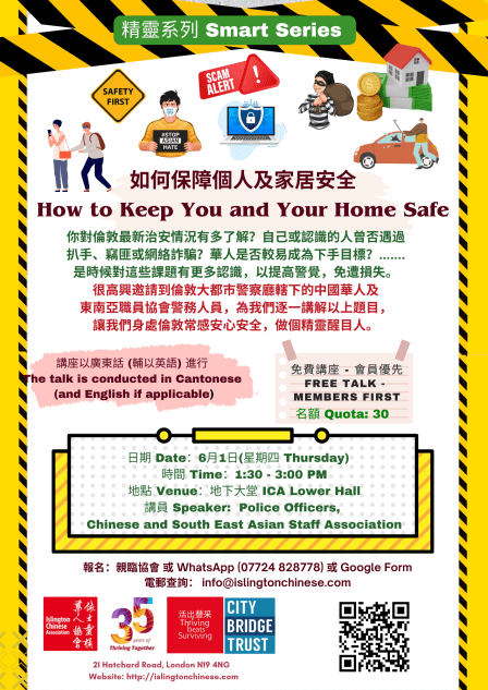 你對倫敦最新治安情況有多了解?自己或認識的人曾否遇過扒手、竊匪或網絡詐騙?華人是否較易成為下手目標?…….是時候對這些課題有更多認識,以提高警覺,免遭損失。我們很高興邀請到倫敦大都市警察廳轄下的中國華人及東南亞職員協會警務人員,為我們逐一講解以上題目,讓我們身處倫敦常感安心安全,做個精靈醒目人。