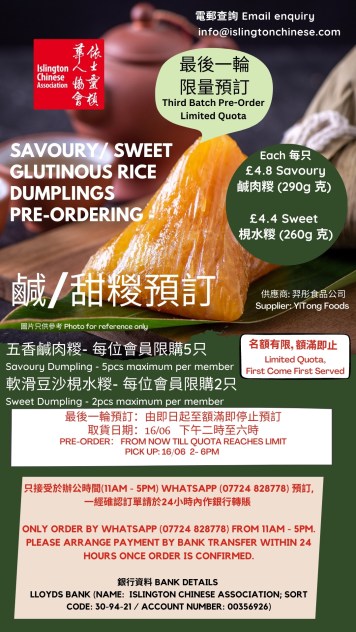 最後一輪鹹肉糭/甜糭今天起開始接受預訂. 由於供應商貨源有限, 每位會員限購最多5只鹹肉糉及2只甜糉, 額滿即停止預訂. 取貨日期為16/06 (星期五) 下午二時至六時.