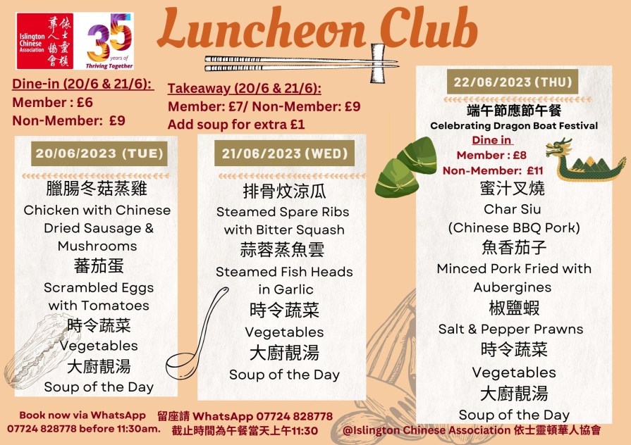 下星期菜單準備好了!當天上午11:30前記得 WhatsApp 07724 828778 留位啦! The latest Lunch Menu is ready! Remember to WhatsApp 07724 828778 and reserve your seat before 11:30 am on the day.