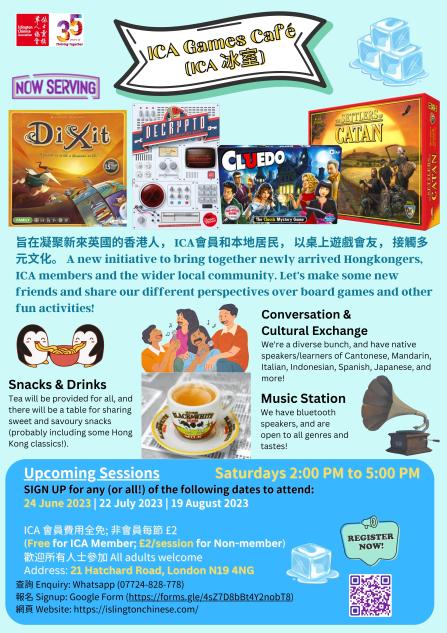 旨在凝聚新來英國的香港人, ICA會員和本地居民, 以桌上遊戲會友, 接觸多元文化。 A new initiative to bring together newly arrived Hongkongers, ICA members and the wider local community. Let’s forge new social ties and celebrate our varied cultures over boardgames and other activities like: Dixit, Decrypto, Cluedo and Catan.