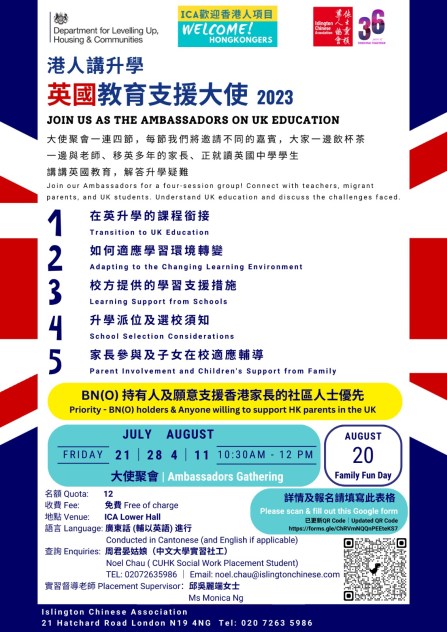 Join ICA’s four-session Ambassador Gatherings this summer and support Hong Kong parents navigating the UK’s educational, social, and cultural changes. Click the link for details and registration: https://forms.gle/p2ufddbZpW5AeWhK6