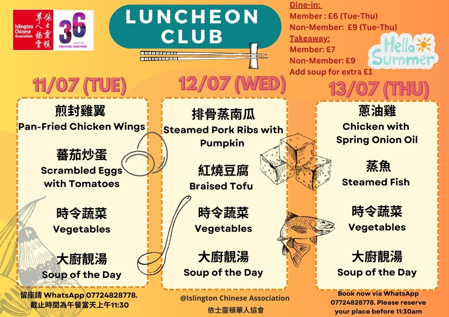 下星期菜單準備好了!當天上午11:30前記得 WhatsApp 07724 828778 留位啦! The latest Lunch Menu is ready! Remember to WhatsApp 07724 828778 and reserve your seat before 11:30 am on the day.