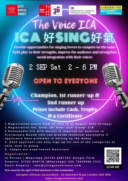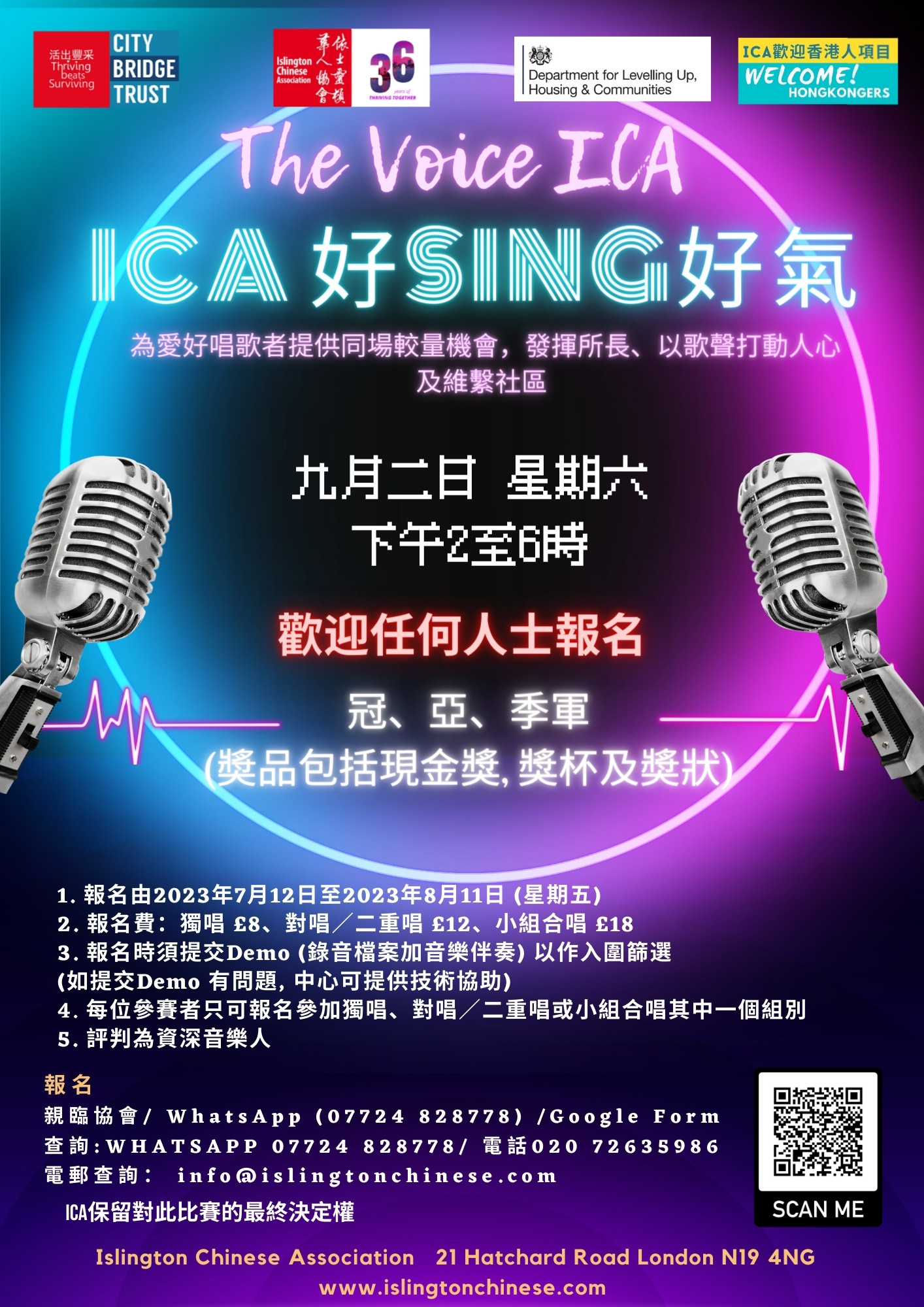 ICA 好SING好氣歌唱比賽於9月2(星期六) 下午2時至6時於ICA 於一樓大廳舉行, 為愛好唱歌者提供同場較量機會,發揮所長、以歌聲打動人心! 賽制及報名詳情參閱海報, 報名截止日期為至8月11日(星期五). 報名可親臨協會或WhatsApp (07724 828778) 或填寫 Google Form https://forms.gle/kDNDwUFyUih1ZSZDA