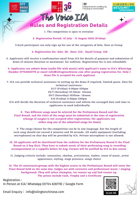 The Voice ICA Singing Competition will be held on 2 Sep (Sat) from 2pm – 6pm at ICA Upper Hall for singing lovers to compete on the same field, play to their strengths, impress the audience and strengthen social integration with their voices. Rules & Registration Details refer to the poster, registration period is until 11 August 2023 (Friday). Registration: In Person / WhatsApp (07724 828778) / Google Form https://forms.gle/4hvxtajzdmaHiDQV8