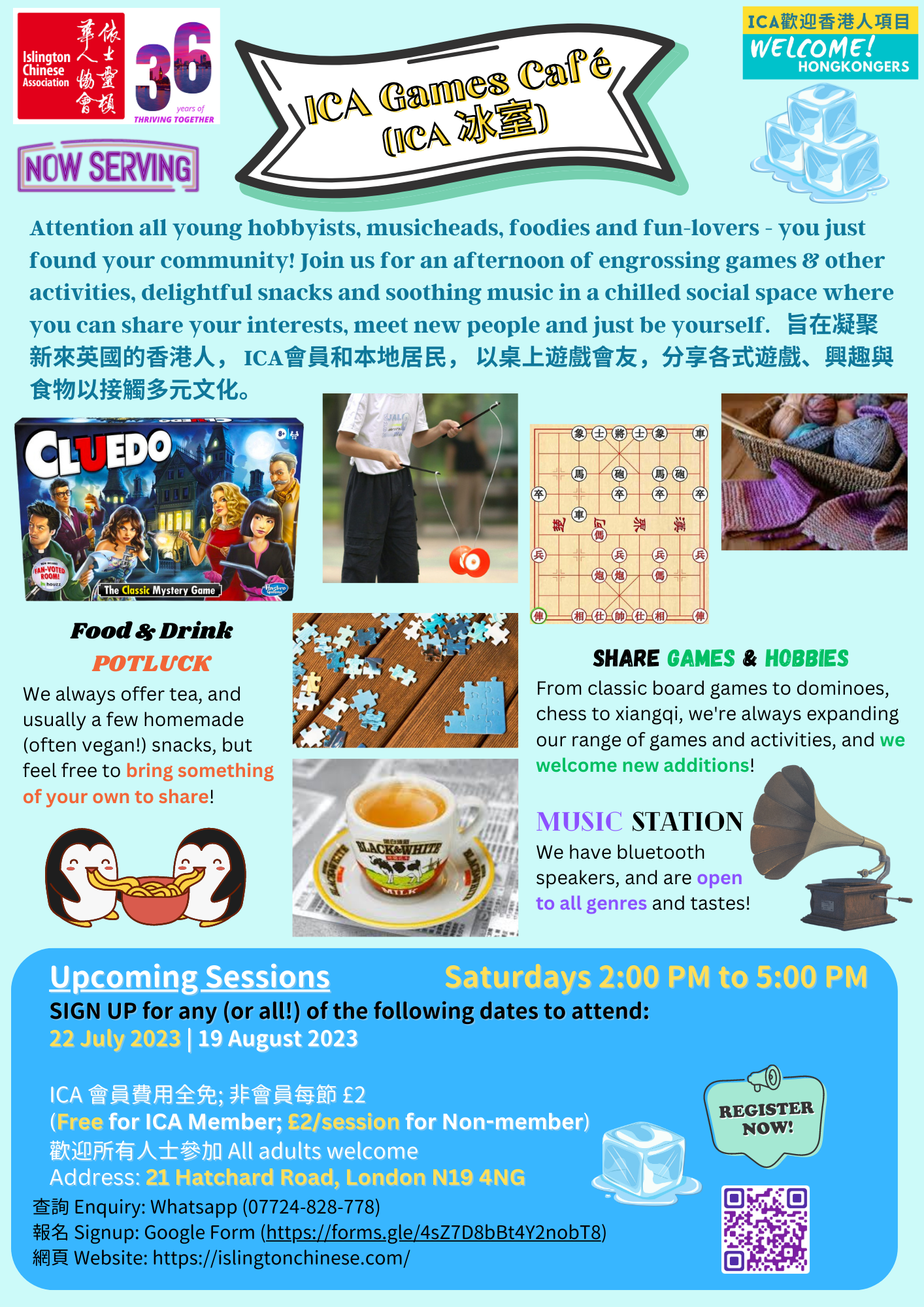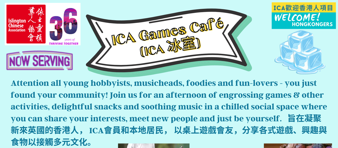 ICA Games Café (ICA 冰室)旨在凝聚新來英國的香港人, ICA會員和本地居民, 以桌上遊戲會友,分享各式遊戲、興趣與食物以接觸多元文化。