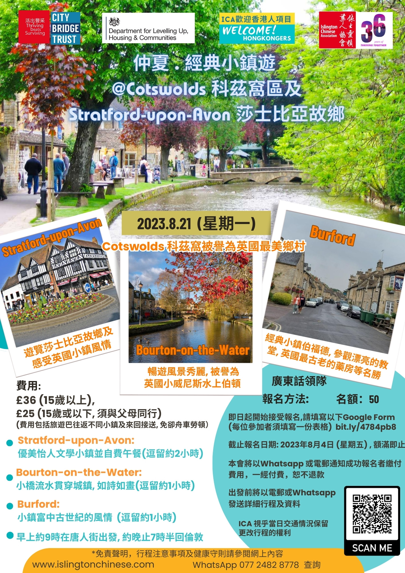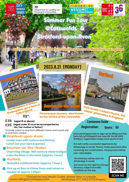免責聲明及健康守則: i.) 參加者必須自行購買旅遊意外及人身安全保險,攜帶個人所需藥物。ii.) 本團須步行一定距 離,旅程中一切意外,本會不負任何法律責任。iii.) 參加者在出發當日請自行檢測及量度體溫,勤洗手,車上不開餐 ,不隨意轉換預先安排座位,保持個人及車廂整潔。 iv.) 所有團費一經繳付及確認,均不設退款。如出發日期前英國政府發出旅遊警告,不允許該段時間英國本地旅遊,所繳旅費即全數退還 Disclaimer and health codes: i) The participants should arrange for their own travel and personal safety insurance and bring your medicine. ii) The walking tour will last for several hours. Please make sure you are fit for walking a long distance. iii)ICA is not responsible for the legal liability in case any accidents occur during the day trip. iii) You are encouraged to take the covid test and measure your temperature before your departure. No eating in the coach; no change of seats allocated; maintain personal hygiene and cleanliness of the coach. iv) All payment is non-refundable. If a travel warning is issued by the UK government, which do not allow local tours in that period of time, the fees will be refunded to the participants.