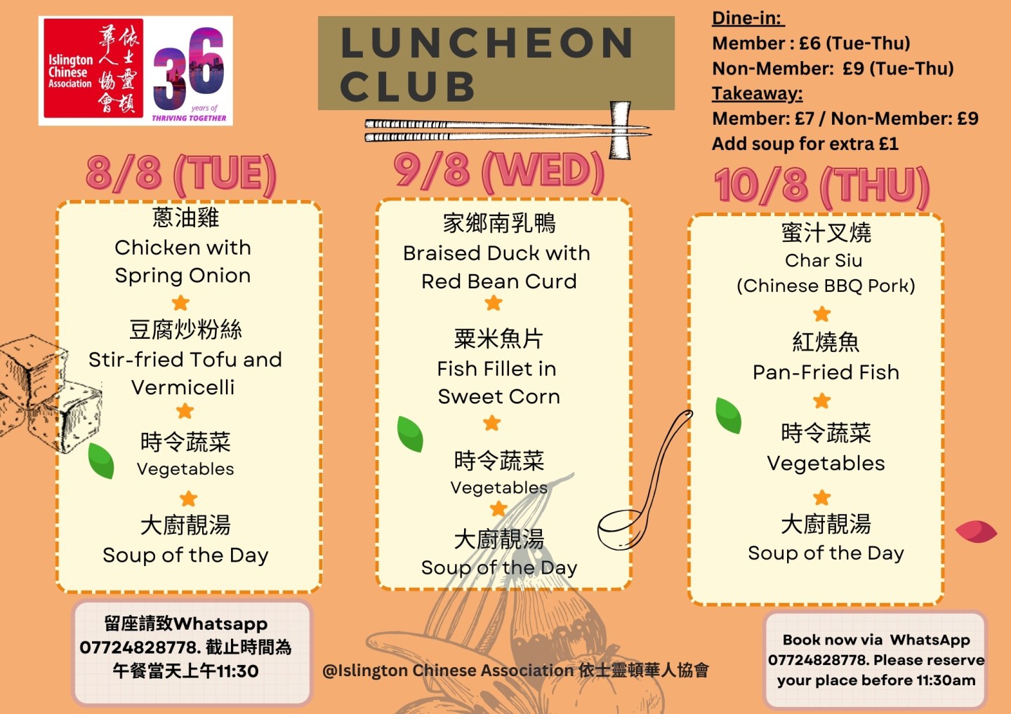 下星期菜單準備好了!當天上午11:30前記得 WhatsApp 07724 828778 留位啦! The latest Lunch Menu is ready! Remember to WhatsApp 07724 828778 and reserve your seat before 11:30 am on the day.