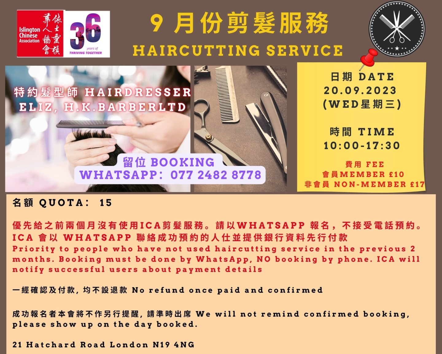 Haircutting Service is available on 20 Sep (Wed) from 10:00 to 17:30 (last booking is at 17:00) by the experienced hair stylist, Eliz. Priority will be given to people who have not used haircutting service in the previous 2 months. Booking must be done by WhatsApp, NO booking by phone. ICA will notify successful users about payment details. (£10 for members and £17 for non-members).