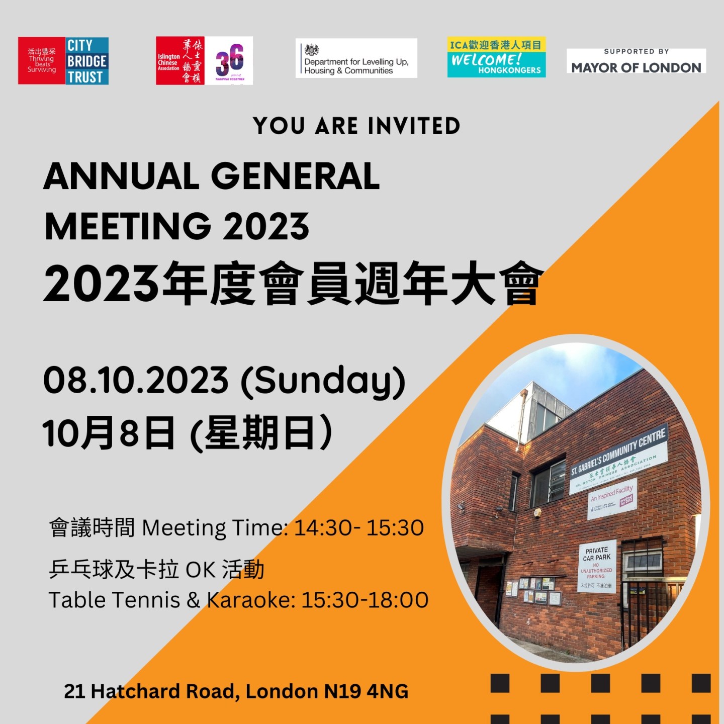 依士靈頓華人協會將於2023年10月8日(星期日)下午二時半至三時半在中心舉行週年大會。