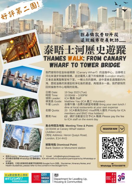 陪伴大家探索倫敦壯闊的歷史之旅:我們會陪你從金絲雀碼頭(Canary Wharf)的金融中心,沿泰晤士河北岸走到倫敦塔橋,走訪羅馬人遺下的倫敦牆 (London Wall);又會走進萬聖教堂地下室,一睹士兵的墓碑。途中還會步過隱蔽的內灣、歷經滄桑的貨運區和淨化後的渠道,再隨清水一曲,我們便悄然回到倫敦市中心喧鬧的街角。 “Thames Walk: Canary Wharf to Tower Bridge” explores London’s history. From Canary Wharf, we’ll journey along the River Thames, visiting the Roman-era London Wall and the crypt of All Hallows-by-the-Tower Church. We’ll stroll through hidden spots, historic cargo areas, and scenic waterways before returning to central London.