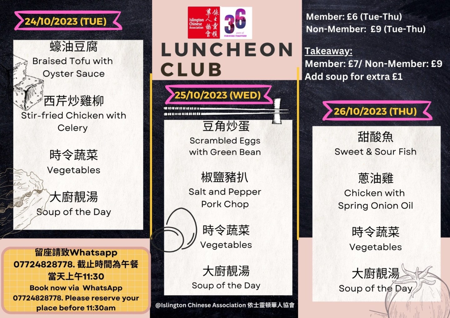 下星期菜單準備好了!當天上午11:30前記得 WhatsApp 07724 828778 留位啦! The latest Lunch Menu is ready! Remember to WhatsApp 07724 828778 and reserve your seat before 11:30 am on the day.