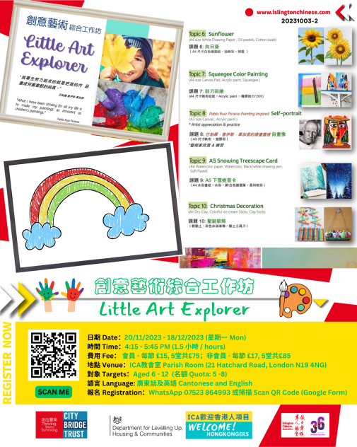 為6-12歲兒童而設的創意藝術綜合工作坊 “Little Art Explorer” 好評如潮,2023年11月20日將再開始新一期5堂課。課程精心編排,每課不同課題、採用不同物料和媒體,啟發孩子的多元潛能,包括觀察、思考、創造、批判、溝通等;孩子更會因此愛上藝術創作。小班教學,名額有限,報名從速。