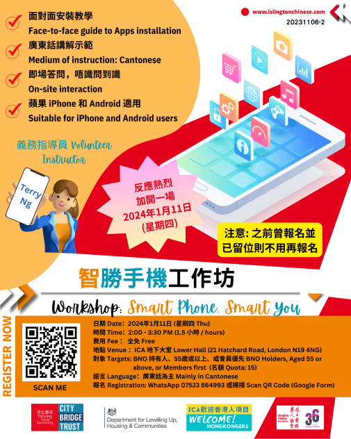 手機早已是我們日常生活不可或缺的工具,不少人認為比我們的錢包更重要!但機不離手的你,真正掌握手機日常功能又有多少?你想多學一點手機程式,讓自己在衣食住行方面更輕鬆、跟家人距離更近、與ICA聯繫更方便嗎?錯過了11月16日的「智勝手機工作坊」的朋友不用擔心,我們將於2024年1月11 日 (星期四) 下午2:00-3:30加開一場,並更新了部分內容,希望能更適切你的需要。