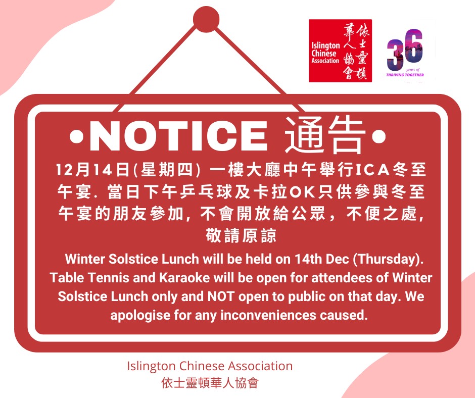 12月14日(星期四) 一樓大廳中午舉行ICA冬至午宴. 當日下午乒乓球及卡拉OK只供參與冬至午宴的朋友參加, 不會開放給公眾,不便之處, 敬請原諒. Winter Solstice Lunch will be held on 14th Dec (Thursday). Table Tennis and Karaoke will be open for attendees of Winter Solstice Lunch only and NOT open to public on that day. We apologise for any inconveniences caused.