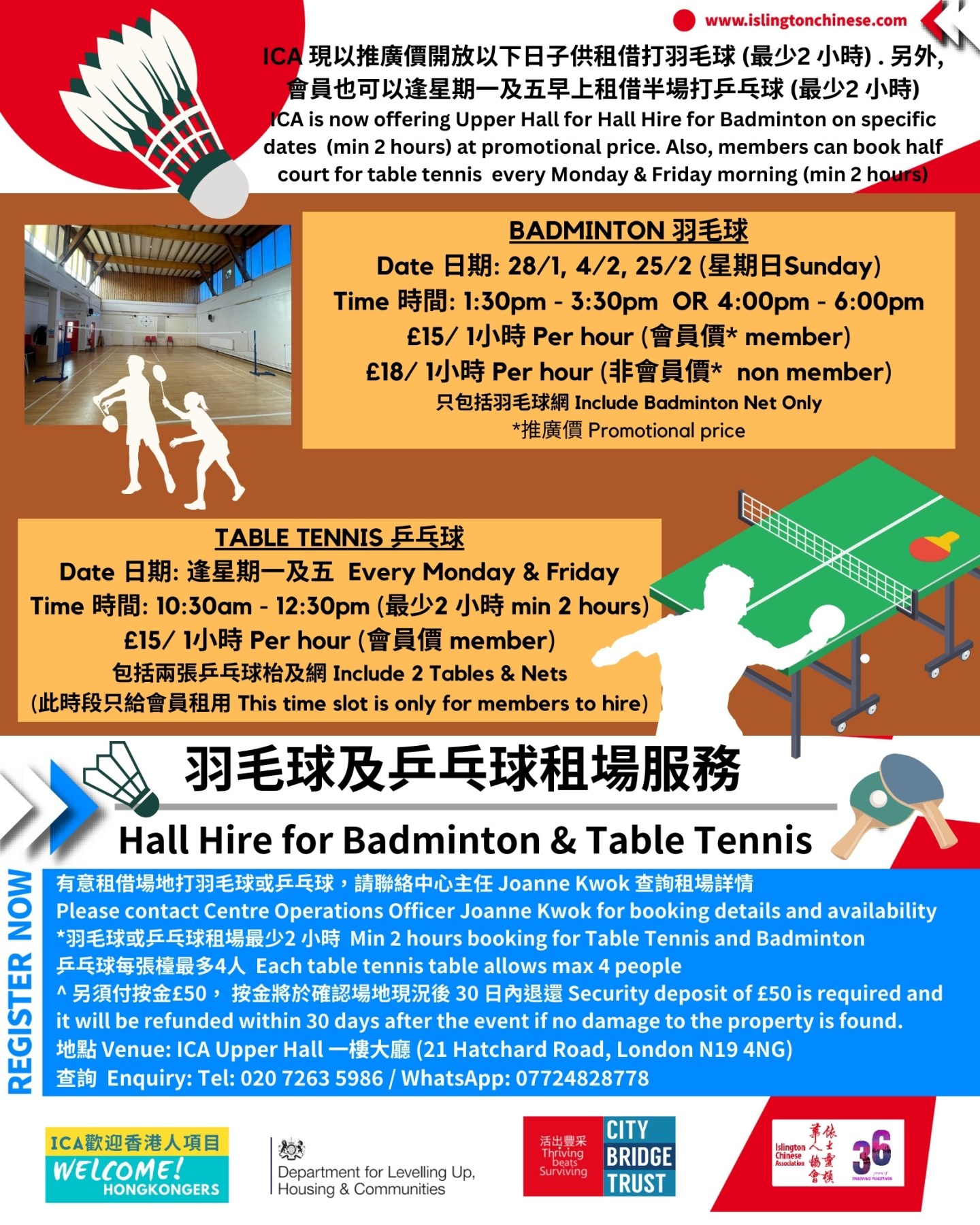 ICA is now offering Upper Hall for Hall Hire for Badminton on (28/1, 4/2, 25/2) at special promotional rate (min 2 hours). Also, members can book half court for table tennis every Monday & Friday in the morning (min 2 hours). Please contact Centre Operations Officer Joanne Kwok for booking details and availability (T: 020 7263 5986/ WhatsApp: 07724 828778) .