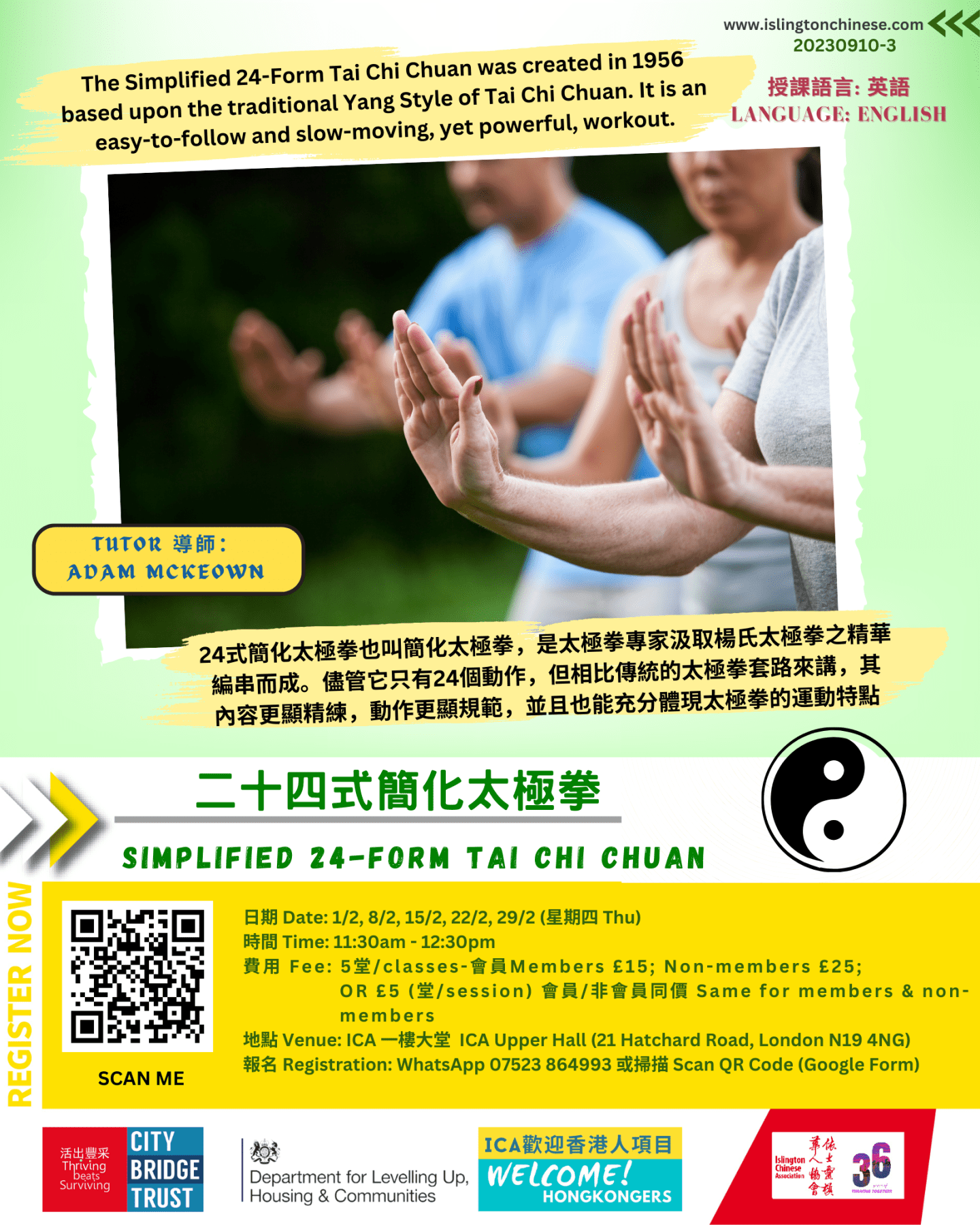 費用 Fee : 5堂/classes – 會員 Members £15; Non-members £25; or £5 (堂/session) 會員/非會員同價 same for members & non-members
