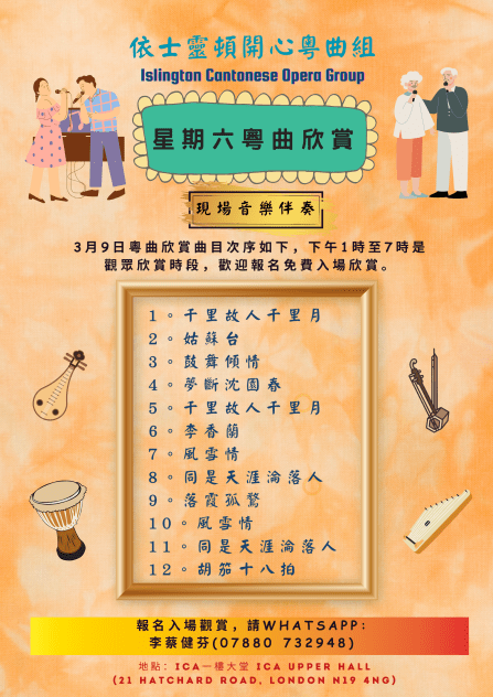 To promote Cantonese Opera and Chinese culture, the Islington Chinese Association and the “Happy Cantonese Opera Group” are joining forces to bring you the “Islington Cantonese Opera Group” in 2024. Starting from 6 January 2024, the group will be open to the public every Saturday from 1:00pm to 7:00pm. We cordially invite you to come and enjoy the Cantonese opera songs with live music for free. If you are interested in joining as a spectator, please reach out to Mrs. Kin Fun Lee at 07880 732948 or Ms. Karen Fong at 07552 352222 via WhatsApp. Address: ICA Upper Hall, 21 Hatchard Road, London N19 4NG.