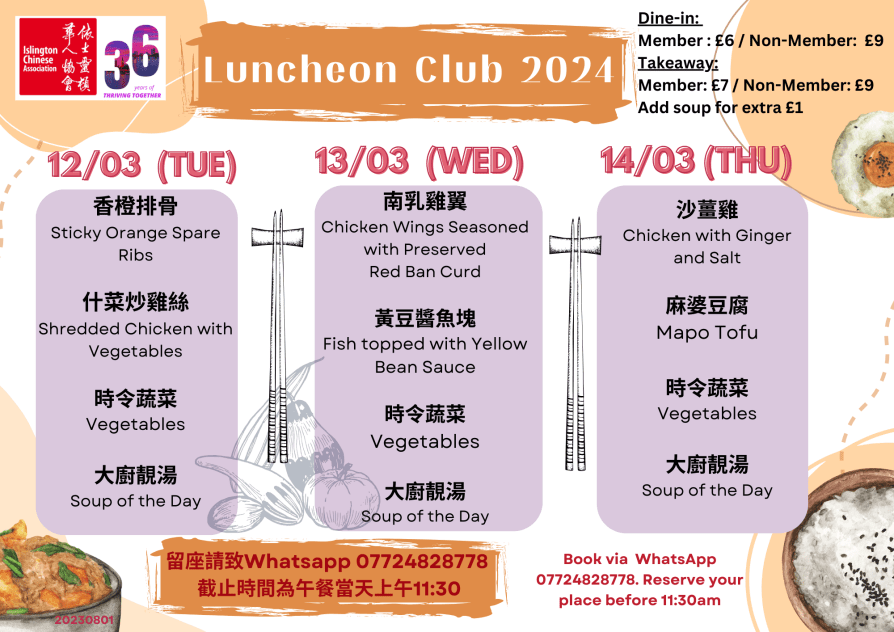 下星期菜單準備好了!當天上午11:30前記得 WhatsApp 07724 828778 留位啦! The latest Lunch Menu is ready! Remember to WhatsApp 07724 828778 and reserve your seat before 11:30 am on the day.