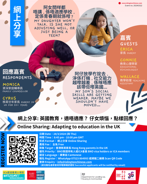 移民英國,家長要兼顧自己同子女嘅適應,真係唔簡單。「ICA 網台」請嚟三位嘉賓,包括香港移英嘅家長、教育心理學家同教學助理,就學生嘅情緒支援、社交能力、價值觀、身份認同等等,分享觀察同建議。仲有資深家庭輔導員同嚟咗英國超過廿年嘅家長作回應,為大家打打氣!