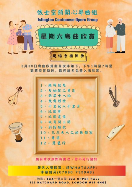 為推廣粵曲及弘揚中華文化,依士靈頓華人協會及「開心粵曲組」於2024年合作開辦「依士靈頓開心粵曲組」。由2024年1月6日起,逢星期六下午1:00至7:00是觀眾免費欣賞粵曲時段,歡迎前來ICA觀賞,報名請WhatsApp 李蔡健芬 (07880 732948)。地點:ICA一樓大堂 (21 Hatchard Road, London N19 4NG)。