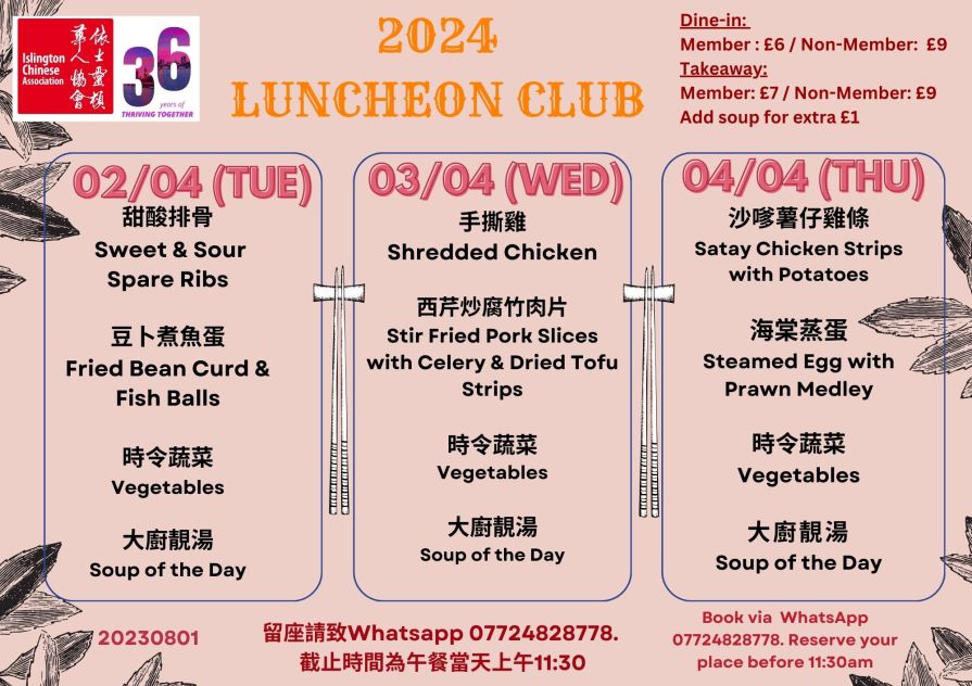 下星期菜單準備好了!當天上午11:30前記得 WhatsApp 07724 828778 留位啦! The latest Lunch Menu is ready! Remember to WhatsApp 07724 828778 and reserve your seat before 11:30 am on the day.