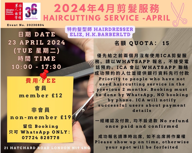 來自香港的髮型師 Eliz 會於4月23日(星期二) 在中心為會員剪髮. 剪髮服務由早上10時至下午5時30(最後預訂時間為下午5時). 由現在起為讓更多朋友能享用剪髮服務, 我們會優先給之前兩個月沒有使用ICA剪髮服務的朋友。請以WhatsApp 報名,不接受電話預約。ICA 會以 WhatsApp 聯絡成功預約的人仕並提供銀行資料先行付款(會員£12,非會員£19)