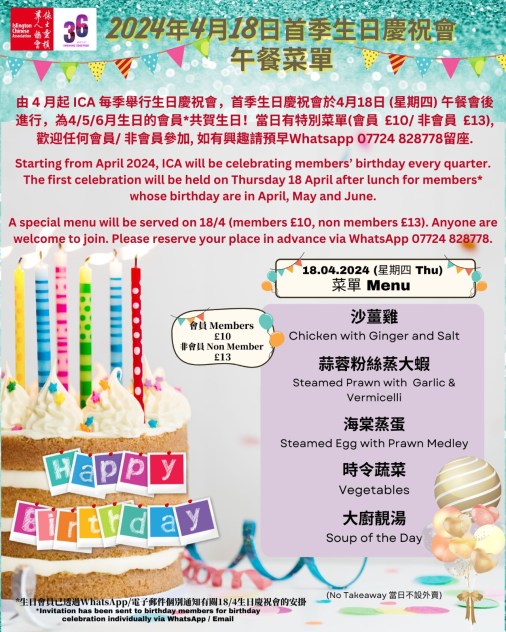 4 月18日 ICA將舉行生日慶祝會,為4/5/6月生日的會員共賀生日!當日午餐有特別菜單 (會員 £10, 非會員 £13) , 任何會員也歡迎参加午餐及生日慶祝會,請預早WhatsApp 07724828778留座.