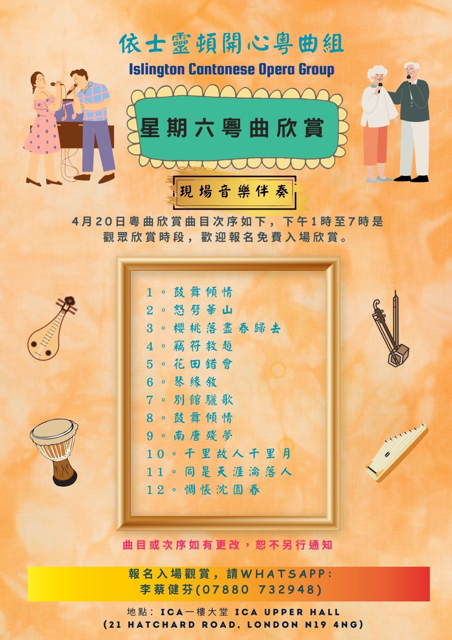 為推廣粵曲及弘揚中華文化,依士靈頓華人協會及「開心粵曲組」於2024年合作開辦「依士靈頓開心粵曲組」。由2024年1月6日起,逢星期六下午1:00至7:00是觀眾免費欣賞粵曲時段,歡迎前來ICA觀賞,報名請WhatsApp 李蔡健芬 (07880 732948)。地點:ICA一樓大堂 (21 Hatchard Road, London N19 4NG)。
