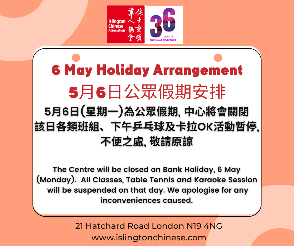 5月6日(星期一)為公眾假期, 中心將會關閉, 該日各類班組、下午乒乓球及卡拉OK活動暫停, 不便之處, 敬請原諒.