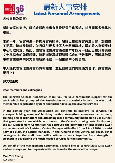 The Islington Chinese Association thank you for your continuous support for our work which has prompted the Association to successfully launch the electronic membership registration system and further develop the diverse services.
