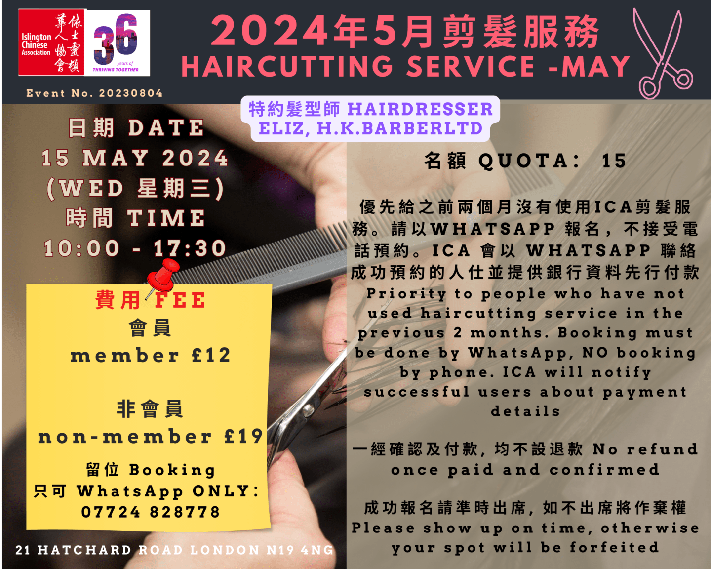 來自香港的髮型師 Eliz 會於5月15日(星期三) 在中心為會員剪髮. 剪髮服務由早上10時至下午5時30(最後預訂時間為下午5時). 由現在起為讓更多朋友能享用剪髮服務, 我們會優先給之前兩個月沒有使用ICA剪髮服務的朋友。請以WhatsApp 報名,不接受電話預約。ICA 會以 WhatsApp 聯絡成功預約的人仕並提供銀行資料先行付款(會員£12,非會員£19)