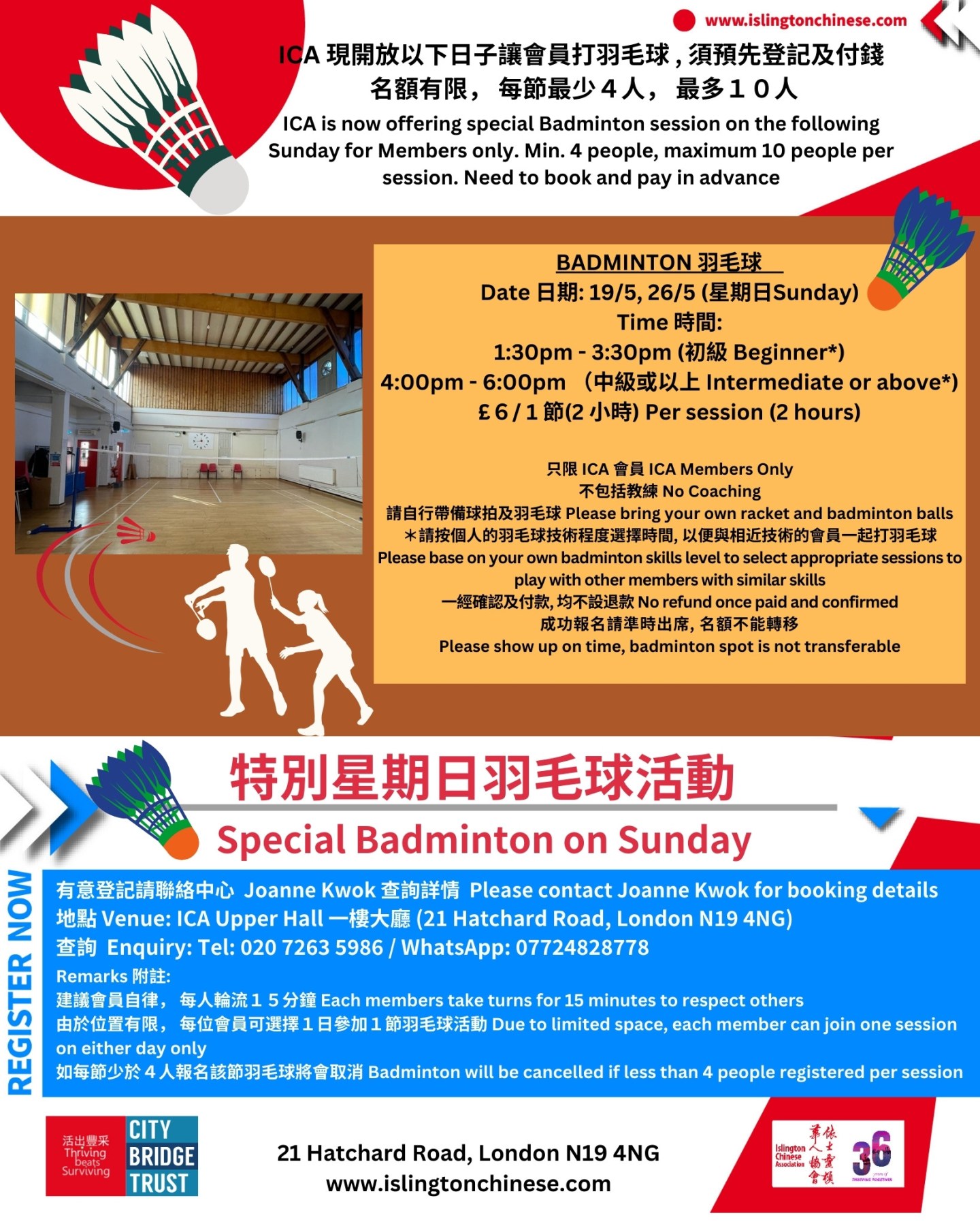 ICA 現開放以下日子讓會員打羽毛球 , 須預先登記及付錢. 名額有限, 每節最少4人, 最多10人 ICA is now offering special Badminton session on the following Sunday for Members only. Min 4 people, maximum 10 people per session. Need to book and pay in advance.