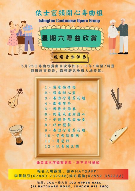 為推廣粵曲及弘揚中華文化,依士靈頓華人協會及「開心粵曲組」於2024年合作開辦「依士靈頓開心粵曲組」。由2024年1月6日起,逢星期六下午1:00至7:00是觀眾免費欣賞粵曲時段,歡迎前來ICA觀賞,報名請WhatsApp 李蔡健芬 (07880 732948) 或 方嘉倫 (07552 352222)。地點:ICA一樓大堂 (21 Hatchard Road, London N19 4NG)。